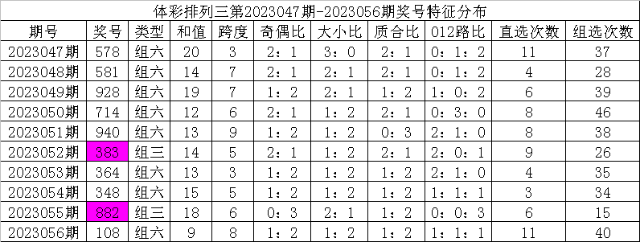 开奖公告:体彩排列三第2023056期开出奖号:108。组六,有重号:8,奇偶比1:2,大小比1:2,012比1:1:1,和值9,跨度8。
