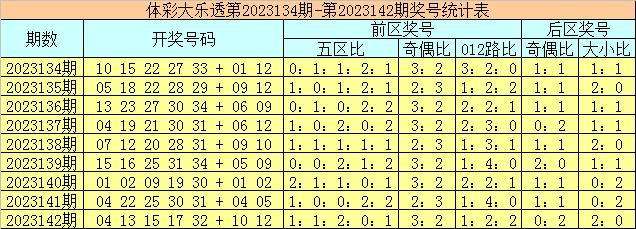 体彩大乐透第2023142期奖号为04 13 15 17 32 + 10 12,前区号码五区比为1:1:2:0:1,奇偶比为3:2,012路比为1:2:2,后区号码奇偶比为0:2,大小比为2:0。