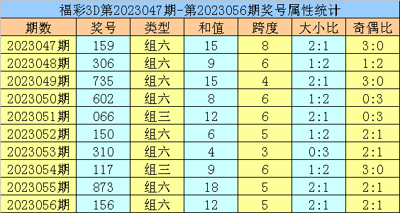 开奖回顾:福彩3D第2023056期开出奖号156。奖号形态为组六,奇偶比为2:1,012路比为1:1:1,大小比为2:1,和值为12,跨度为5。