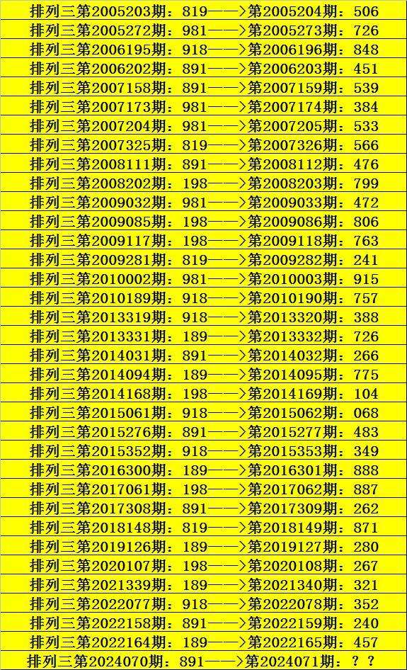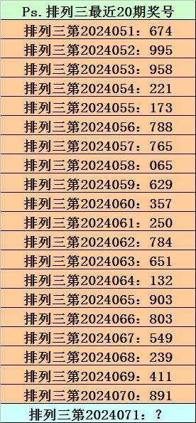 第2024070期排列三奖号为891,历史上该号码组选开出35次,下期奖号分别为:506、726、848、451、539、384、533、566、476、799、472、806、763、241、915、757、388、726、266、775、104、068、483、349、888、887、262、871、280、267、321、352、240、457。