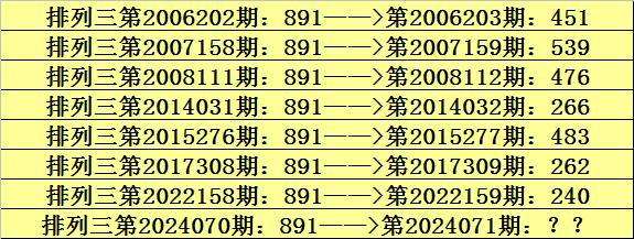 第2024070期排列三奖号为891,历史上该号码直选出现8次,下期奖号分别为:451、539、476、266、483、262、240。