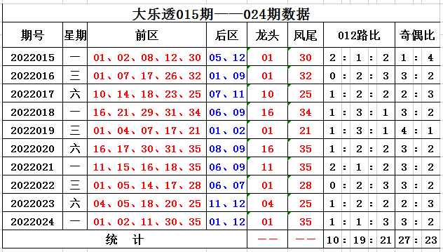 上期开奖:体彩大乐透第2022024期开奖号码为:01、02、11、30、35+01、12。前区五区比为2:1:0:0:2,和值为79,首尾间距为34,奇偶比为3:2,无重号。后区号码和值为13,跨度为11。