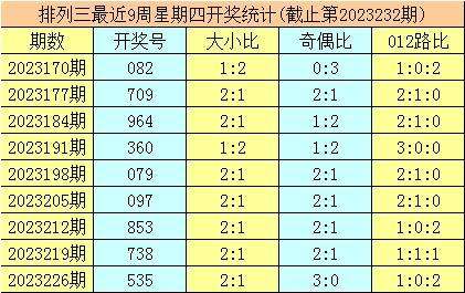 三、体彩排列三前9周星期四奖号分别开出:082-709-964-360-079-097-853-738-535,其中号码012路比为15:5:7,奇偶比为15:12,大小比为16:11;