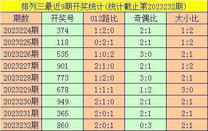 二、体彩排列三前9期奖号开出:374-118-535-901-773-678-949-365-860,其中奖号大小比为16:11,012路比为12:9:6,奇偶比为17:10;