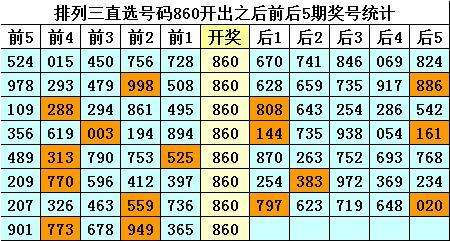 四、排列三直选号码860历史上开出8次,其前后五期奖号分别为: