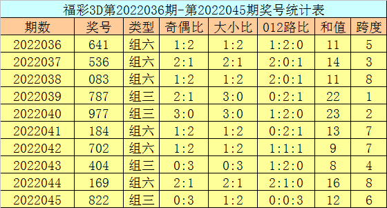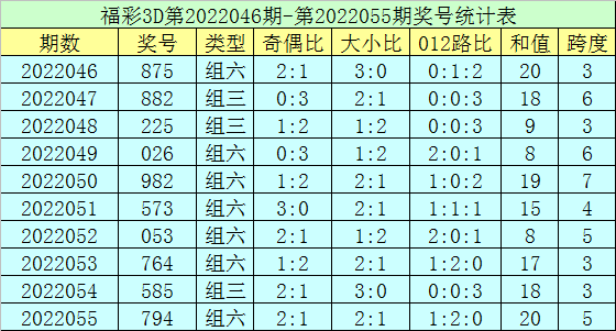 上期回顾:福彩3D第2022055期开奖号码为794,组选类型为组六,奇偶比为2:1,大小比为2:1。