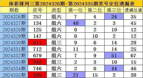 开奖回顾:排列三第2024335期奖号为:499,各位号码遗漏值分别为21、15、2,遗漏总值为38。