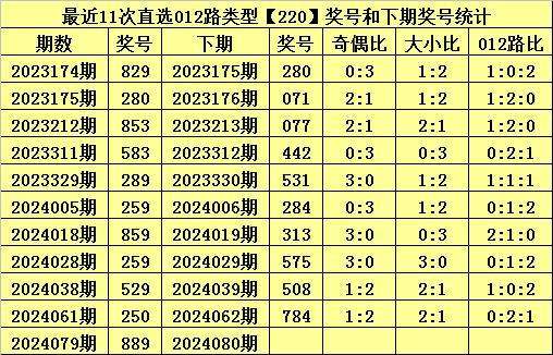 排列三上期开出奖号为:889,其直选012路类型为220,历史上直选220号码已开出了230次,最近11期分别开出奖号为:829、280、853、583、289、259、859、259、529、250、889。