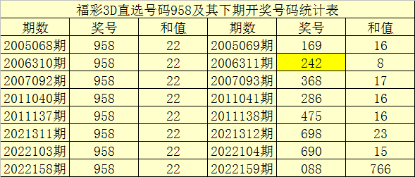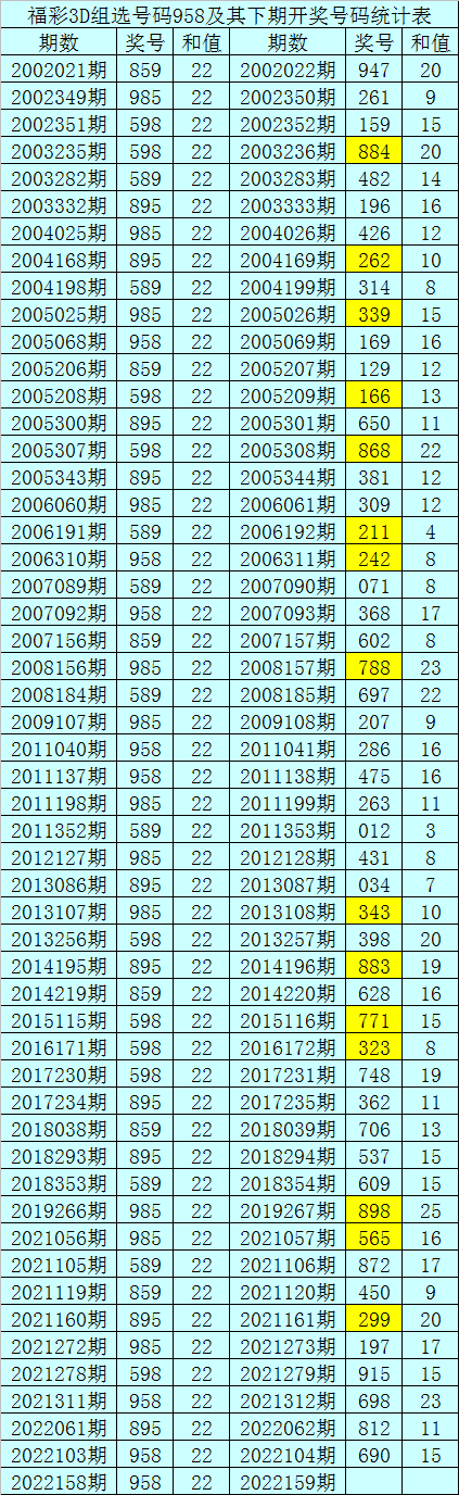 一、开奖回顾:第2022158期福彩3D奖号为958。奖号奇偶比为2:1,和值为:22,跨度为:4。