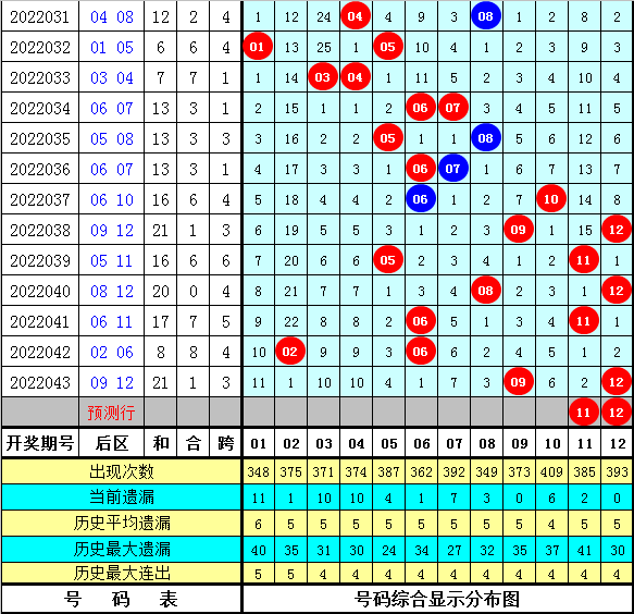 上期回顾:大乐透第2022043期奖号:02 16 17 24 30+09 12,前区奖号012路比为2:1:2,后区奖号为0路+0路号码。