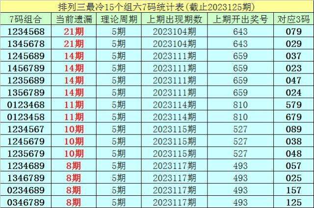 (1)在排列三已开出的6546期奖号中(统计截止第2023125期),目前7码组六遗漏值最大的组合为:1234568、1345678,本期遗漏21期;