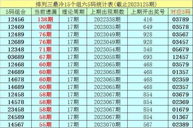 (1)目前排列三5码组六遗漏期数最大的组合为:12456,目前轮空138期;