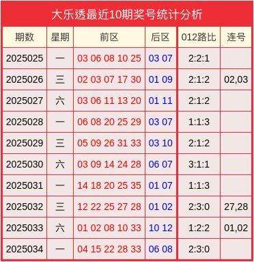 开奖回顾:大乐透2025034开奖号码为04、15、22、28、33+06、08。其中012路比为2:3:0、无连号。