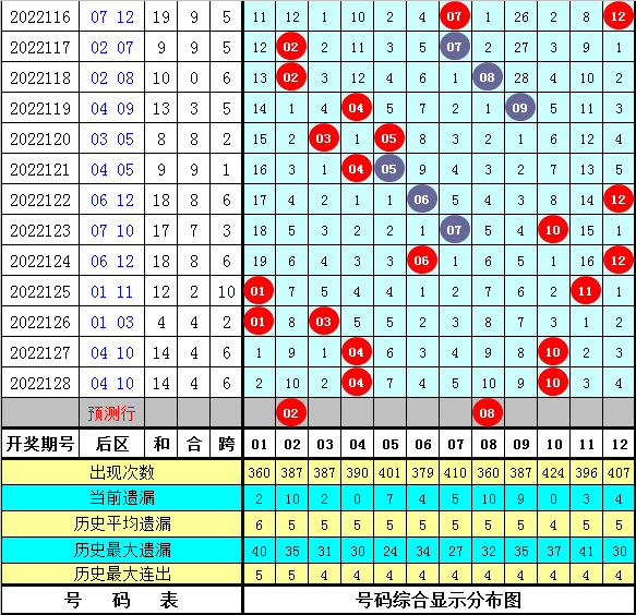 后区分析:上期后区奖号为04+10,本期后区注意重复号码出现,大范围参考号码01、02、04、08。