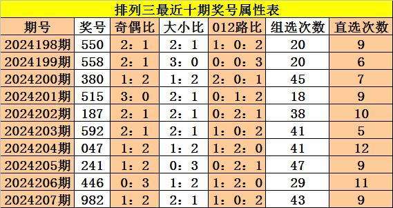 上期回顾:体彩排列三第2024207期奖号:982,奇偶比1:2,大小比2:1,012比1:0:2。