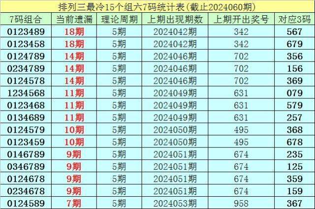 (2)在排列三第2024060期奖号中,最冷的7码组六遗漏18期,在这18期奖号中,组六号码开出13期,出现概率为72%,半顺组合开出6期,含1期全顺组合,开出概率为33%;杂六组合开出7期,开出概率为39%。