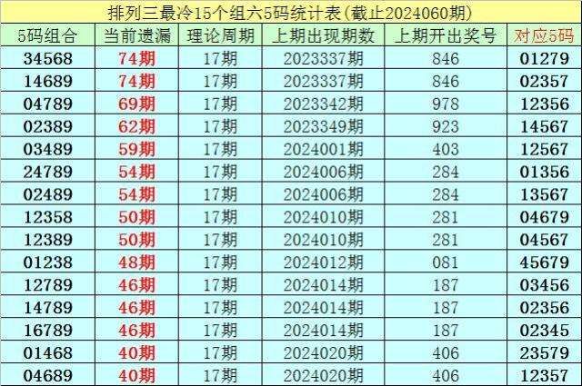 (4)排列三第2024060期遗漏值最大的十个5码组六组合解冻了1个;