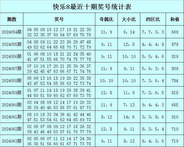 福彩快乐8第2024063期开奖回顾:02 05 06 07 11 12 14 17 24 30 36 38 51 56 60 61 67 71 73 78,其中奖号四区比为8:4:3:5,奇偶比比为9:11,大小比为8:12,和值为719。