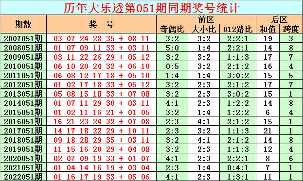 在历史同期奖号中,后区奖号跨度尾数大小比为10:6(定义:跨度1、2、3、10、11为小尾跨度,跨度4、5、6、7、8、9为大尾跨度),其中大尾跨度开出频次较多,本期预计继续开出大尾跨度,关注跨度5。