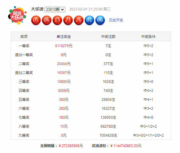 上期开奖:体彩大乐透第2023010期奖号为05 06 13 23 26 + 01 06,前区三区比为2:2:1,奇偶比为3:2,和值为73,012路比为1:1:3。
