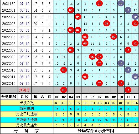 上期后区开出号码:07+10,一奇一偶组合、全1路组合、全大组合。本期后区看好一奇一偶组合,关注两码02、11。