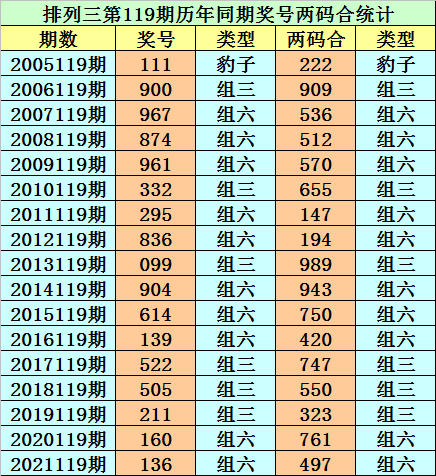 排列三从2004年开奖至今已开出6188期奖号了,其中第119期历史同期奖号出现17次,历年第119期分别开出号码:111、900、967、874、961、332、295、836、099、904、614、139、522、505、211、160、136。