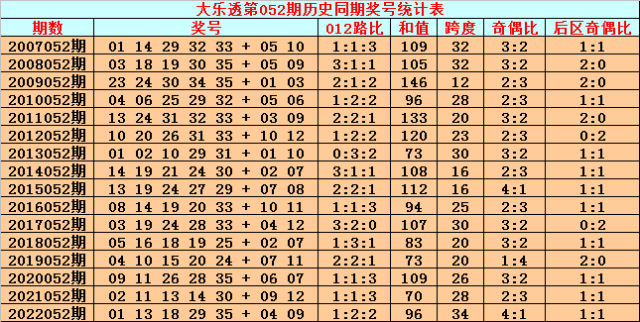 综上所述,大乐透第2023052期前区012路比参考2:1:2。
