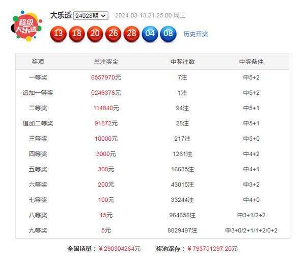 上期开奖:体彩大乐透第24028期开奖号码:13 18 20 26 28+04 08,前区和值:105,跨度:15,奇偶比:1:4,大小比:4:1,五区比:0:1:2:2:0,没有出现重号。