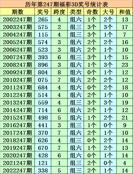 历年第248期福彩3D同期奖号为:251 - 593 - 383 - 900 - 998 - 119 - 795 - 412 - 463 - 370 - 690 - 115 - 708 - 995 - 139 - 856 - 251 - 262 - 822 - 050。