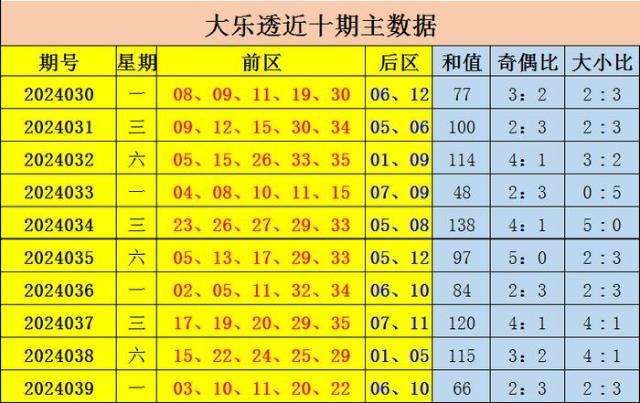 大乐透上期奖号为:前区03、10、11、20、22;后区06 10;,和值66,奇偶比为2:3,大小比为2:3。