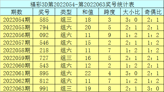 开奖回顾:福彩3D第2022063期奖号为:991。奖号形态开出组三,奇偶比开出3:0,012路比为2:1:0,大小比为2:1。