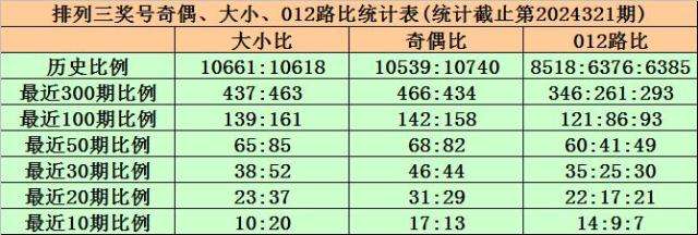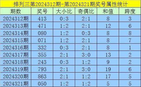 上期回顾:排列三第2024321期出现奖号050。开出组三,奇偶比1:2,012路比2:0:1,大小比1:2,和值5,跨度5。