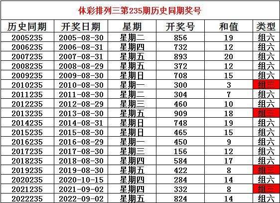 2023年9月2日排列三第235期开奖,历史同期分别开出奖号: