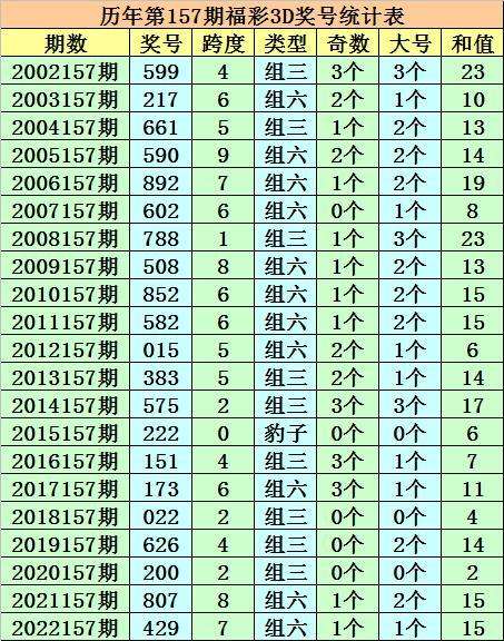 历年第157期福彩3D同期奖号为:599 - 217 - 661 - 590 - 892 - 602 - 788 - 508 - 852 - 582 - 015 - 383 - 575 - 222 - 151 - 173 - 022 - 626 - 200 - 807 - 429。
