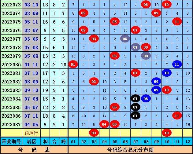 后区号码分析:在第088期历史同期开奖中奖,奖号03 06 08出现5次,奖号01 11出现4次,奖号02 09 10 12出现2次,奖号07出现1次,奖号04 05没有出现。本期后区五码参考03、06、07、10、12。