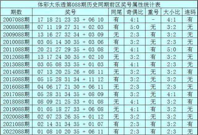 体彩大乐透第088期历史同期开出16次奖号,其统计详见下表: