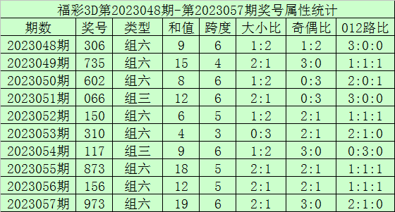 开奖回顾:福彩3D第2023057期开奖号:973,其中奖号和值:19,奇偶比3:0,大小比2:1。