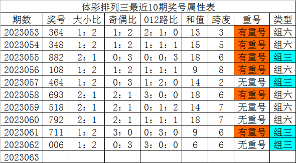 体彩排列三最近10期分别开出奖号:364、348、882、108、464、693、518、792、711、006,各奖号属性详见下表: