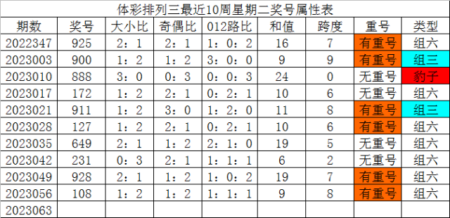 体彩排列三最近10周星期二奖号分别为:925、900、888、172、911、127、649、231、928、108,各奖号属性详见下表: