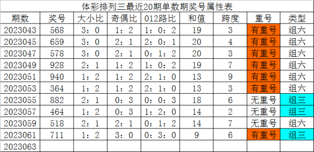 体彩排列三最近20期单数期奖号分别为:568、659、578、928、940、364、882、464、518、711,各期奖号详细属性下表: