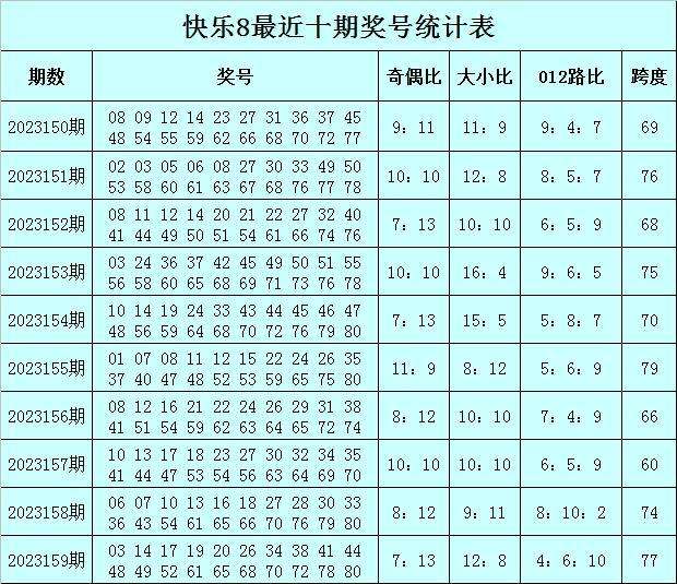 福彩快乐8第2023159期开奖回顾:03 14 17 19 20 26 34 38 41 44 48 49 52 61 65 68 70 72 78 80,其中奖号奇偶比开出7:13,大小比开出12:8,012路比开出4:6:10,和值为899,跨度为77。