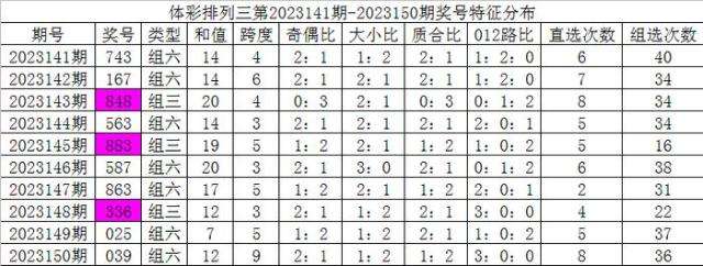 开奖公告:体彩排列三第2023150期开出奖号:039。组六,有重号:0,奇偶比2:1,大小比1:2,012比3:0:0,和值12,跨度9。