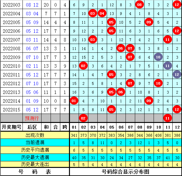 1。在历史同期开奖中,后号码012路比为15:6:9,其中012路号码轮空期数分别为:4期、9期和2期,本期后区012路号码参考0:0:2。