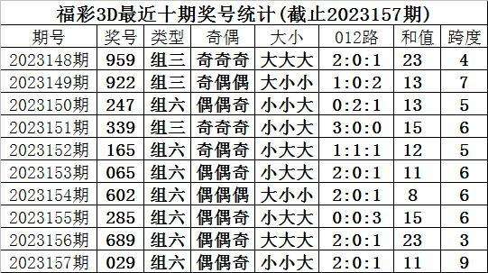 开奖回顾:福彩3D第2023157期奖号为029,奖号形态为:组六、小小大、2:0:1、偶偶奇。