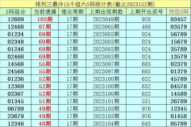(4)排列三第2023152期遗漏值最大的十个5码组六组合解冻了2个;