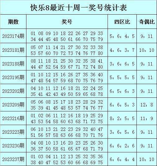 福彩快乐8第2023237期(上周一)开奖回顾:01 03 04 11 12 13 25 32 35 36 38 40 47 52 53 60 66 68 69 75,其中奖号四区比为6:6:4:4奇偶比为10:10。