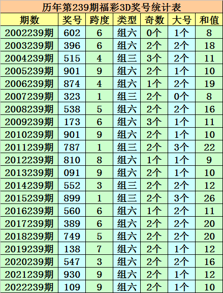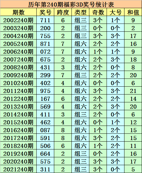 在以上奖号中奖,历年第240期福彩3D出现8次组三,出现12次组六。组三、组六比例持平,本期注意组六出现。