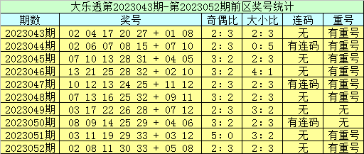 开奖回顾:体彩大乐透第23052期奖号开出:02 08 11 30 33+05 08,前区奖号奇偶比为2:3,012路比为2:0:3,大小比为2:3,没有开出连码,包含2个重号:11、33。