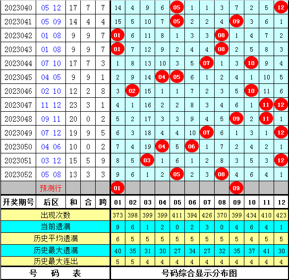后区分析:后区上期开出奖号05 08,在最近15期开奖中奖,后区各号码频次分别为:号码12开出5次,号码05开出4次,号码07、08、10开出3次,号码01、04、06、09、11开出2次,号码02、03开出1次。本期预计后区在01、03、04、07、08、09之中出现,精选两码01+09。
