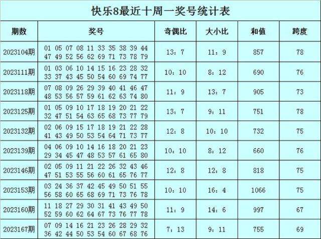 福彩快乐8第2023167期(上周一)开奖回顾:07 09 14 16 21 23 26 28 29 32 36 42 44 50 53 54 60 67 68 76,其中奖号和值为755,跨度为69,奇偶比为7:13,大小比为9:11。